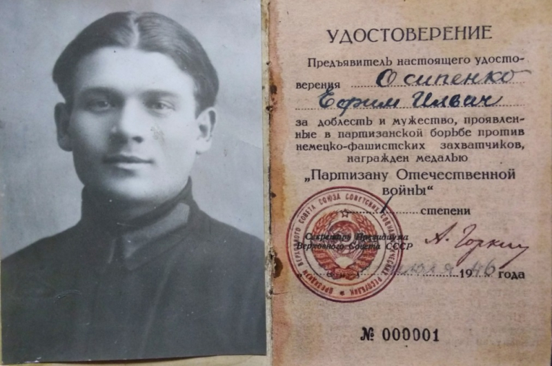 Значимый вклад в победу над немецкими захватчиками в годы Великой Отечественной войны внесли те, кто боролся с врагом в партизанских отрядах. Чтобы отметить их отвагу и героизм 2 февраля 1943 года в Советском Союзе была учреждена медаль «Партизан Отечественной войны». Известно, что этой награды были удостоены почти 150 тысяч партизан. В этой статье речь пойдет об одном из таких героев – партизан - Ефиме Осипенко, который первым в стране получил такую медаль за №000001.